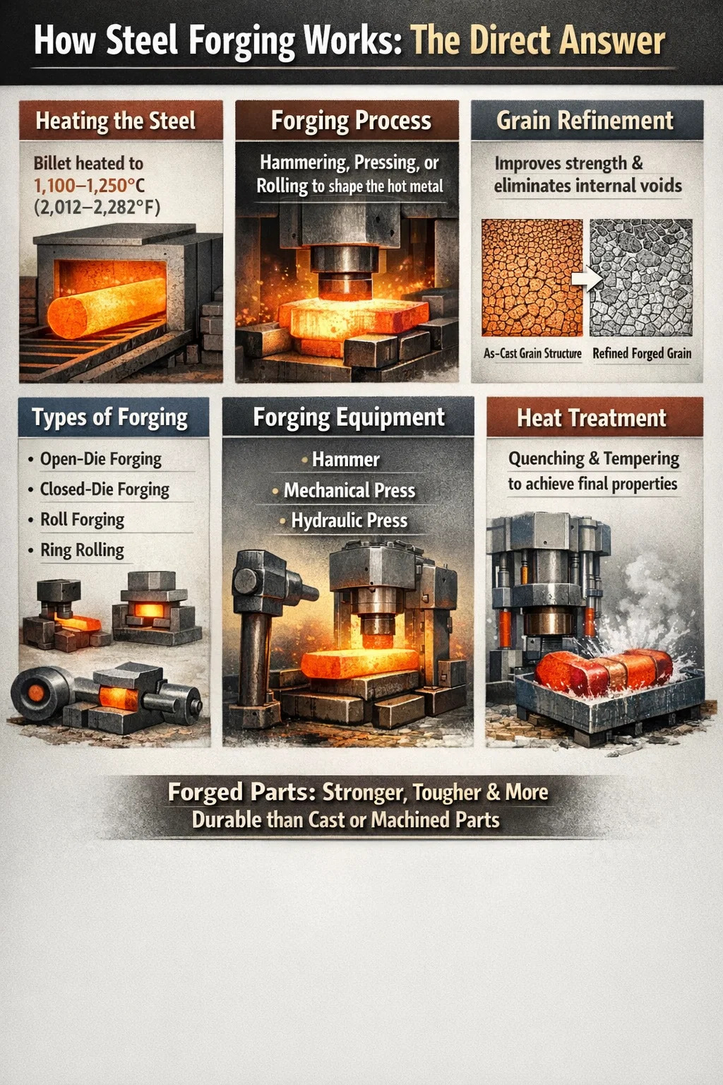 Stahlschmieden ist der Prozess, bei dem Stahl durch Aufbringen einer Druckkraft – entweder durch Hämmern, Pressen oder Walzen – geformt wird, während das Metall auf eine Temperatur erhitzt wird, die es plastisch und bearbeitbar, aber nicht geschmolzen macht. Das Ergebnis ist ein Teil mit überlegene mechanische Eigenschaften im Vergleich zu gegossenen oder bearbeiteten Bauteilen, da der Schmiedeprozess die innere Kornstruktur verfeinert und innere Hohlräume eliminiert.