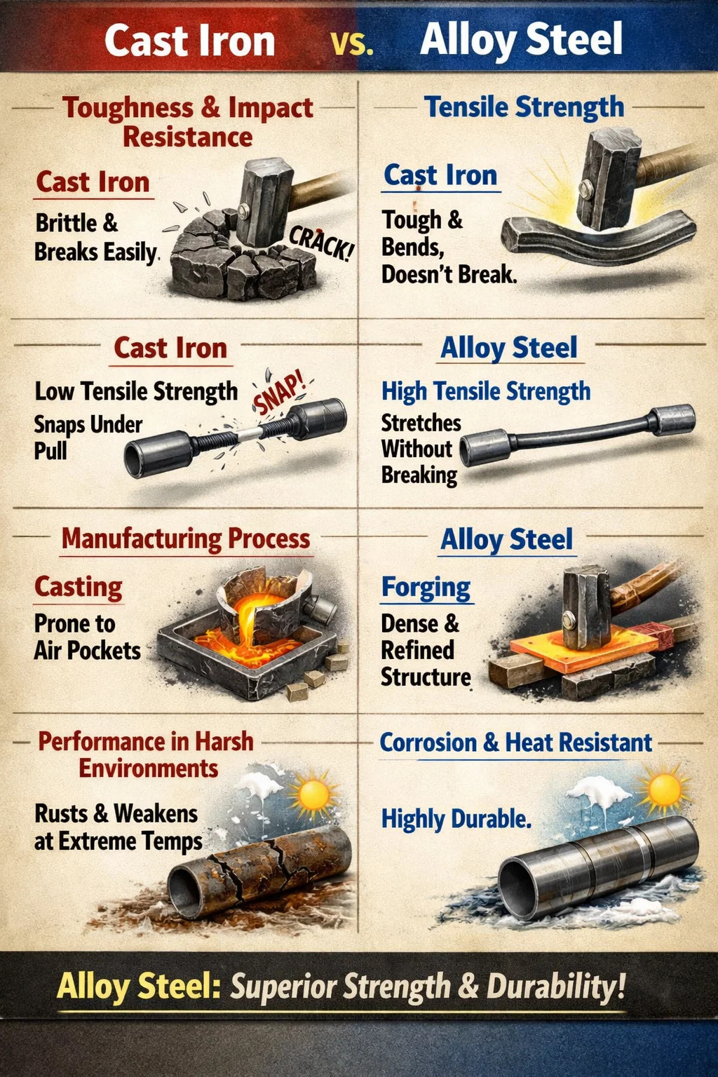 Legierter Stahl ist im Allgemeinen stärker und haltbarer als Gusseisen, insbesondere wenn er Stößen, Spannungen und starkem Druck ausgesetzt ist. Während Gusseisen seine Stärken in bestimmten spezifischen Anwendungen hat (z. B. bei der Herstellung von Töpfen oder Maschinenbasis), ist legierter Stahl im Hinblick auf die Gesamtleistung das überlegene Material.