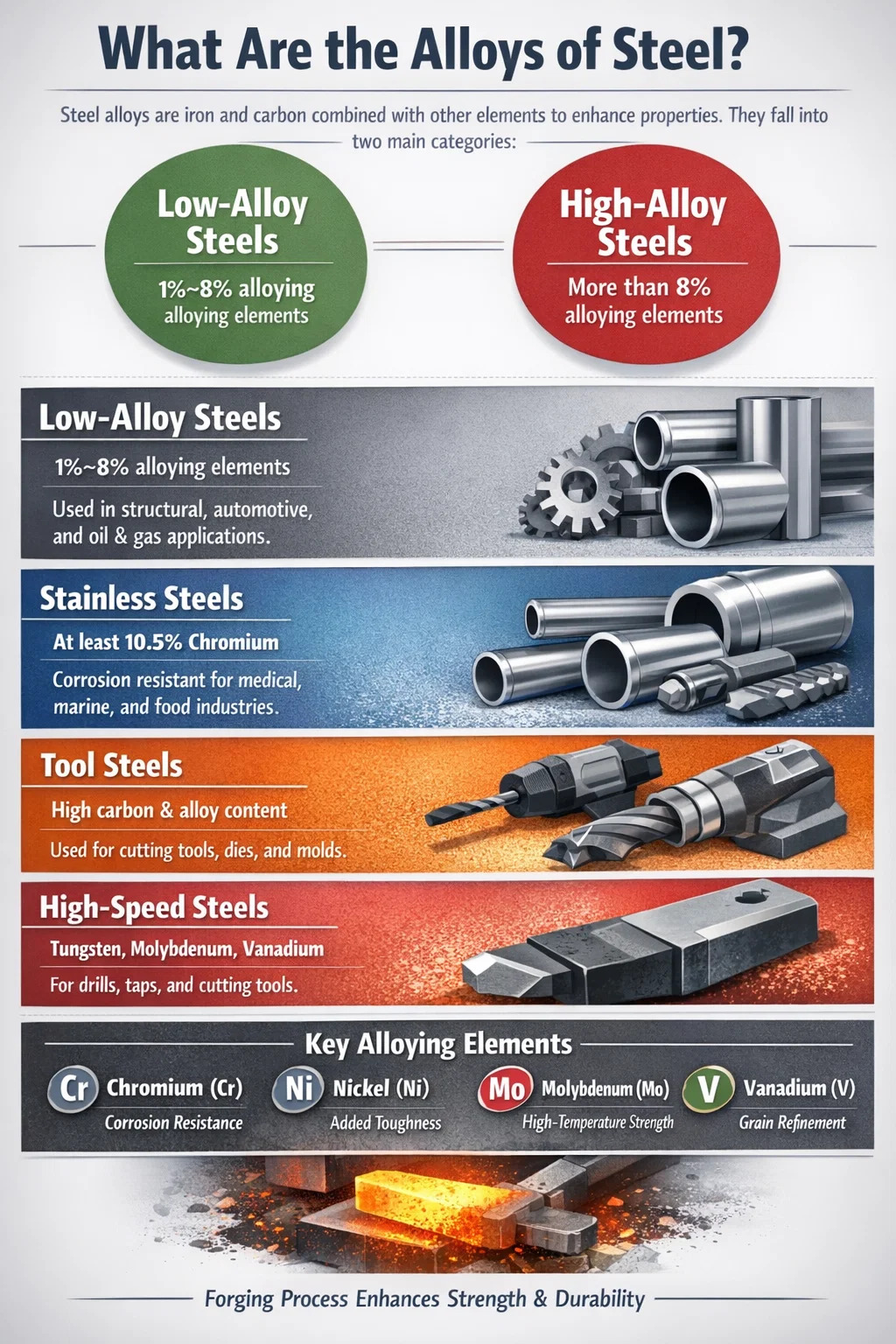 Stahllegierungen entstehen durch die Kombination von Eisen und Kohlenstoff mit einem oder mehreren zusätzlichen Legierungselementen – wie Chrom, Nickel, Molybdän, Vanadium, Mangan oder Wolfram – um Materialien mit spezifischen mechanischen, thermischen oder chemischen Eigenschaften herzustellen, die normaler Kohlenstoffstahl allein nicht bieten kann. Die große Familie spaltet sich in zwei Hauptzweige: niedriglegierte Stähle , die insgesamt weniger als 8 % Legierungselemente enthalten, und hochlegierte Stähle , die diesen Schwellenwert überschreiten und rostfreie Stähle und Werkzeugstähle umfassen.
