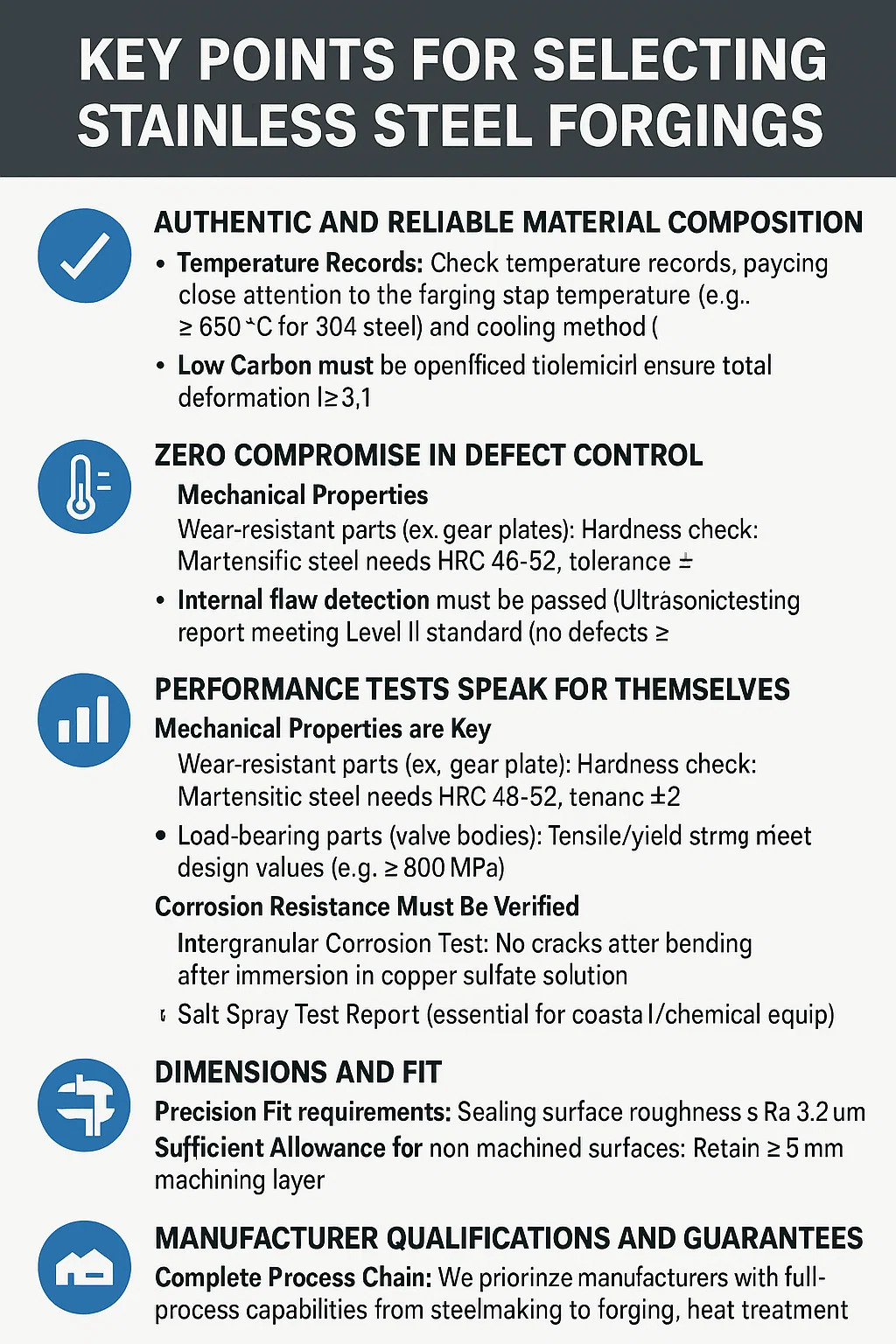 Temperaturaufzeichnungen müssen überprüft werden: Fordern Sie Heizkurven an und achten Sie dabei genau auf die Schmiedestopptemperatur (z. B. ≥850 °C für 304-Stahl) und die Kühlmethode (Abschrecken mit Wasser/langsames Abkühlen).