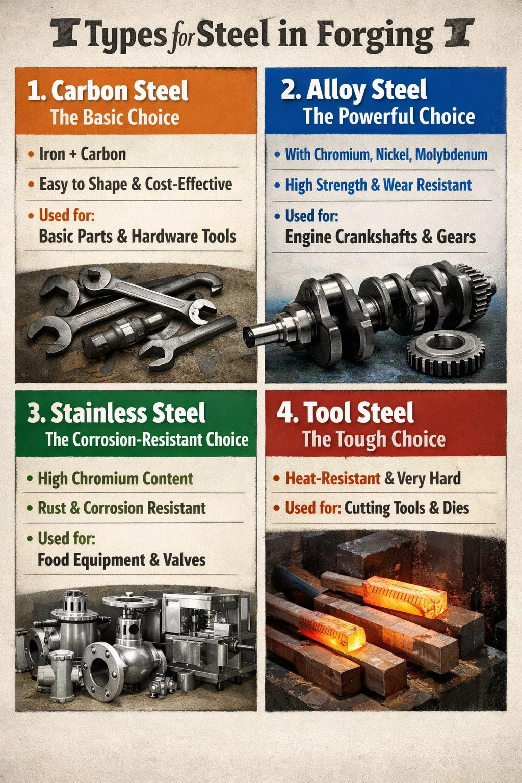 In der tatsächlichen industriellen Produktion eignet sich nicht jeder Stahl zum „Erhitzen und Hämmern“. Um sicherzustellen, dass die resultierenden Teile sowohl robust als auch langlebig sind, Stahlschmieden Typischerweise werden je nach Anwendung die folgenden gängigen Stahlsorten verwendet: